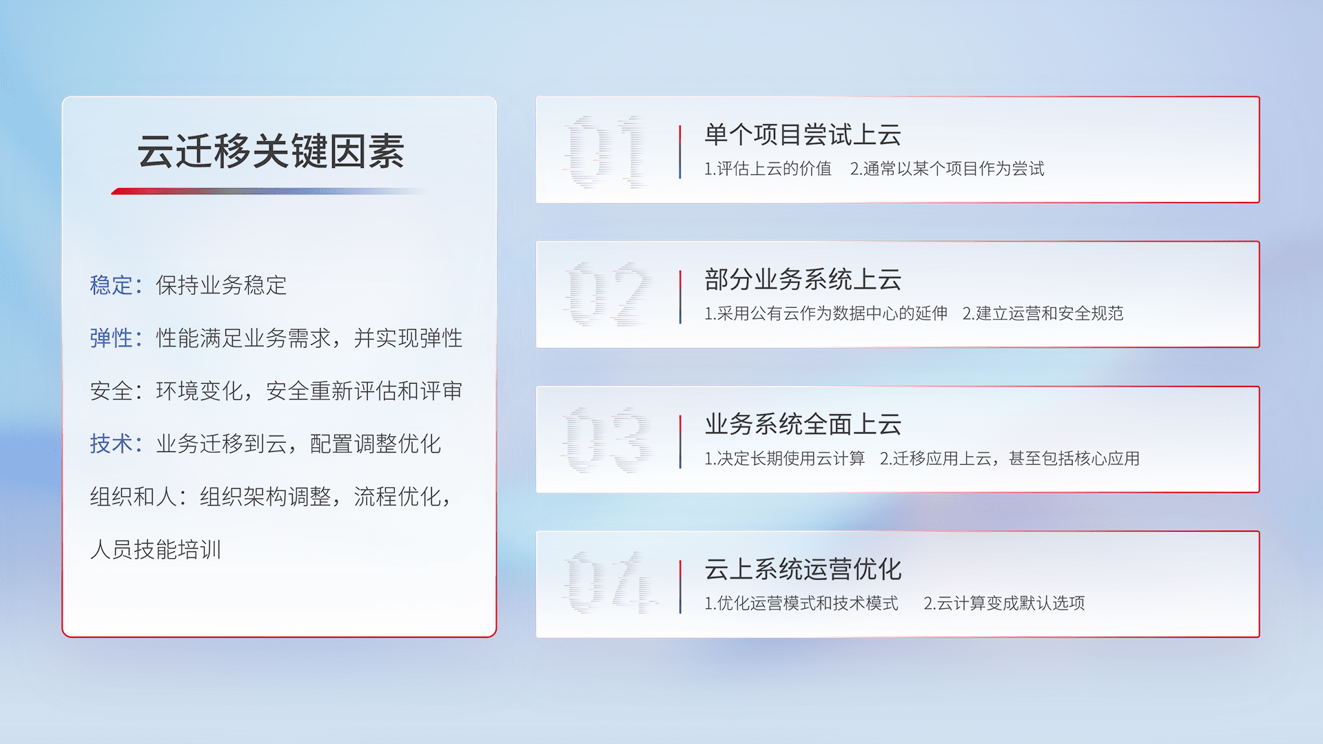 结合实际业务,,从规划设计、、、、云平台选型、、、、云原生改造、、、、数据迁移、、集成交付,,,迁移全过程为客户识别最佳上云路径,,做好风险识别管理,,设计网络架构、、、、身份权限、、、、安全审计合规、、操作审计、、日志审计、、、监控告警策略、、、、多站点容灾设计等,,,,对云上基础设施进行整体规划,,,提升IT治理水平,,,,以满足弹性、、、高可用、、高性能的需求。。。