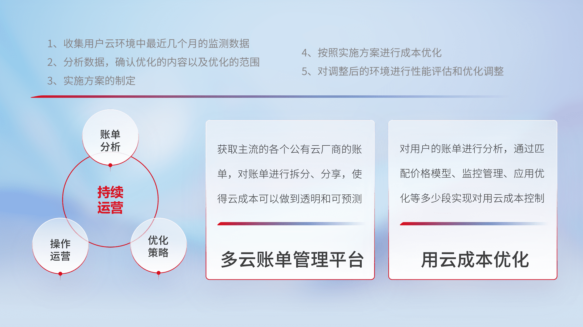 通过多云纳管,,,,以统一的资源数据模型把客户的云资源进行抽象和封装,,,,进而实现对多云资源的统一操作,,,保障云资源管理的可靠性、、、稳定性与可用性。。量身定制化运维内容,,,,配置、、、开发运维、、、、补丁管理、、、备份、、、监控、、、、认证和访问管理、、审计和日常巡检等,,,保障在用云过程中的可靠度,,,稳定度以及高可用率。。。
