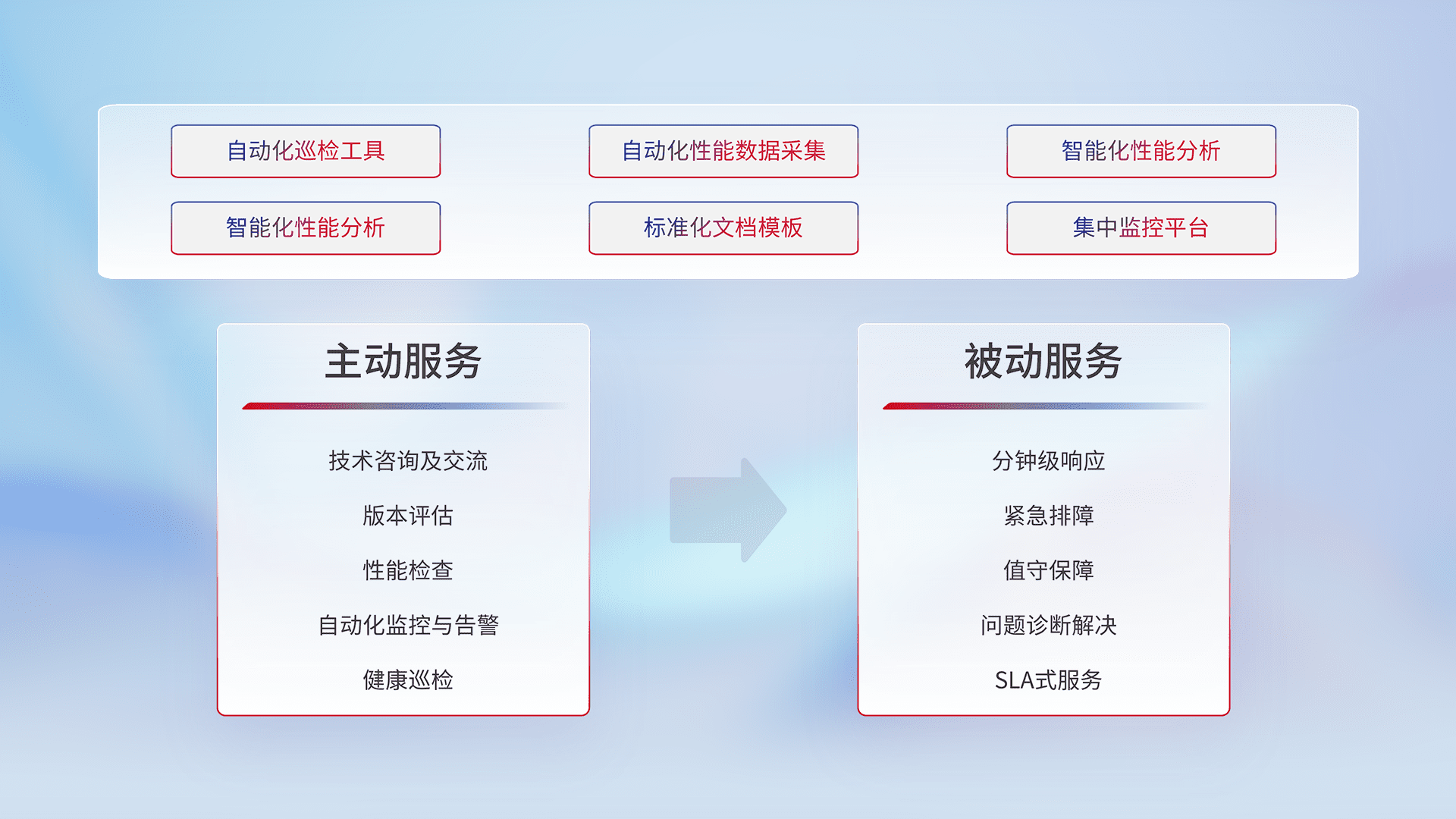 智能化工具和标准化文档,,,保障服务质量,,提供主动服务(包含技术咨询、、、版本评估、、性能检查、、自动化监控与告警、、健康巡检)和被动服务包含(分钟级响应、、、紧急排障、、、、值守保障、、、、问题诊断解决、、、、SLA服务)。。。。