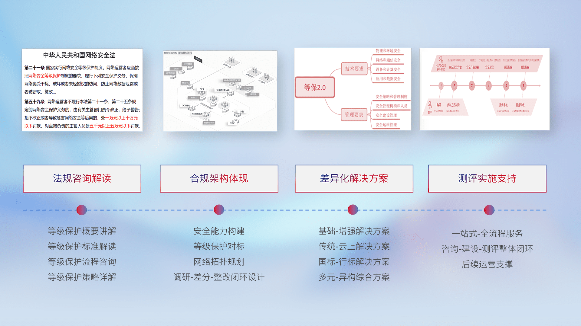 通过专业的法律咨询解读、、、、合规架构体现、、、、差异化解决方案、、、、测试实施支持等服务,,,,为客户量身打造等保合规体系。。